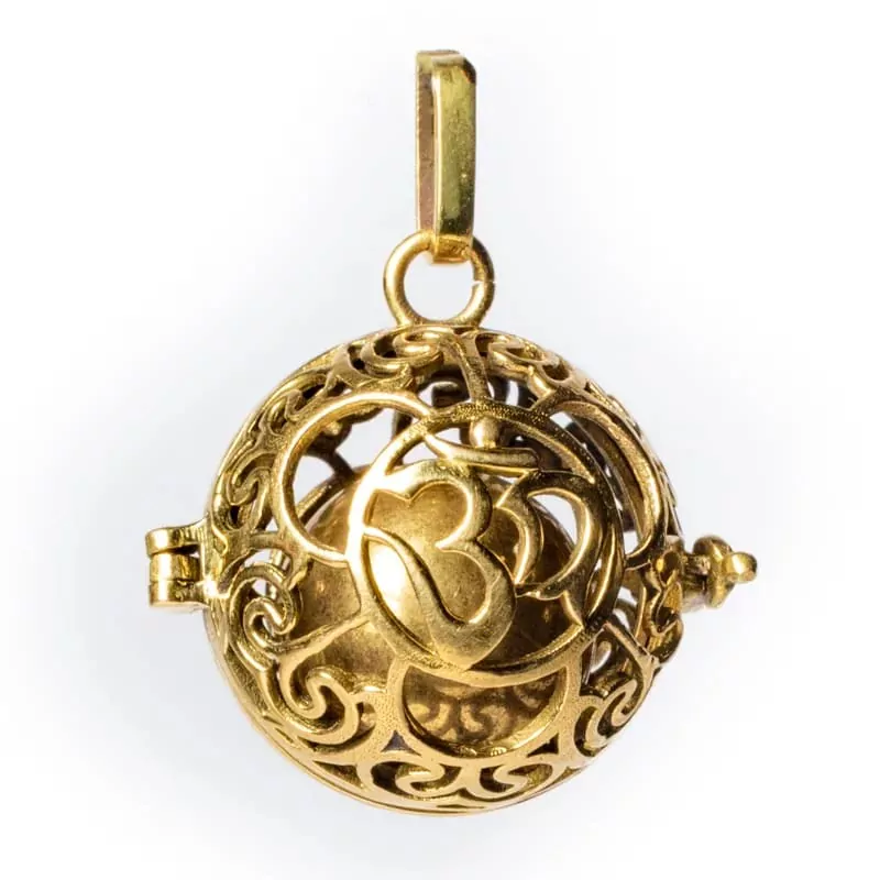 Amulet se symbolem Ohm, který lze vyplnit kuličkou lávy nebo mosaznou rolničkou.
