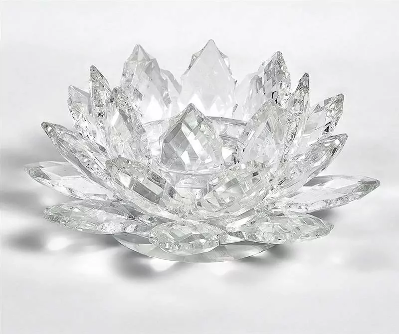 Svícen na čajovou svíčku ve tvaru lotosového květu je vybroušený z čirého, křišťálového skla.