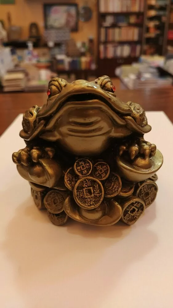 Červenooká třínohá žába střežící hromadu mincí. Na chtivých "ručkách" drápy zabořené do zlatých ingotů...právě tráví minci, kterou pak vyplivne na dlouhou šnůru k tomu připravenou...s obrazem souhvězdí Velkého vozu na zádech...