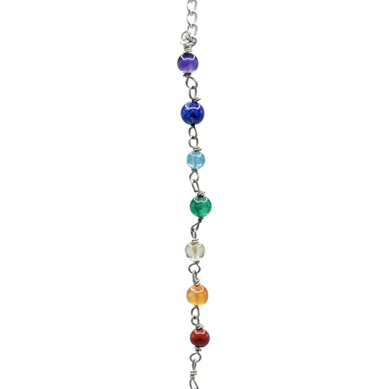 Kyvadlo ve tvaru růženínové kuličky se stříbrnou, mosaznou špicí a řetízkem zdobeným čakrovými kameny.